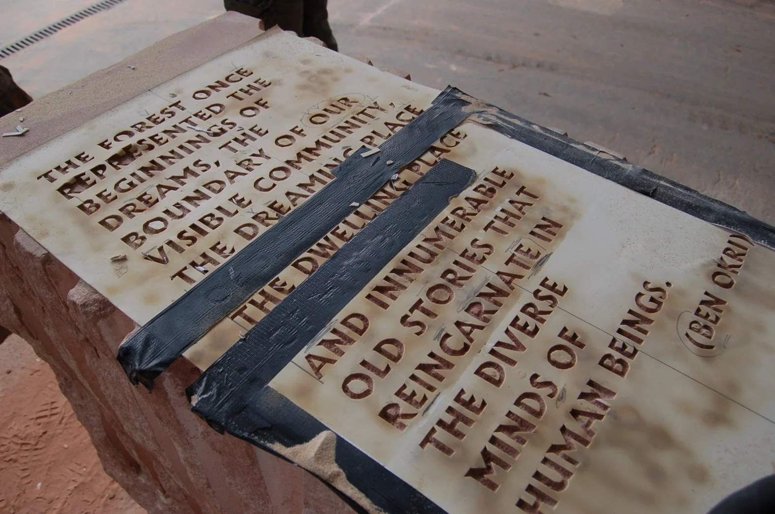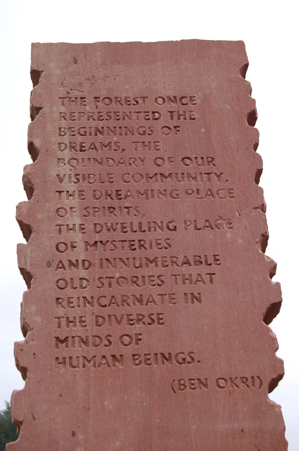 So I dispensed with this form…however the experience of working in the quarry in the depths of the forest, and travelling through the forest in early morning light, with long shadows and rays of light coming through avenues of trees had begun to alter my intentions of the piece. Co-incidentally I was reading a book by the African writer Ben Okri, set in a town in the middle of a dreamlike forest. He made some very insightful quotes about the nature of the forest and its relationship with the human psyche, myths, dreams and spirits. I decided to use the central block, removed from the middle of the piece in the creation of the passage space, as a part of the sculpture and onto this vertical form, juxtaposed with the horizontal passageway, I engraved a quote by Ben Okri.