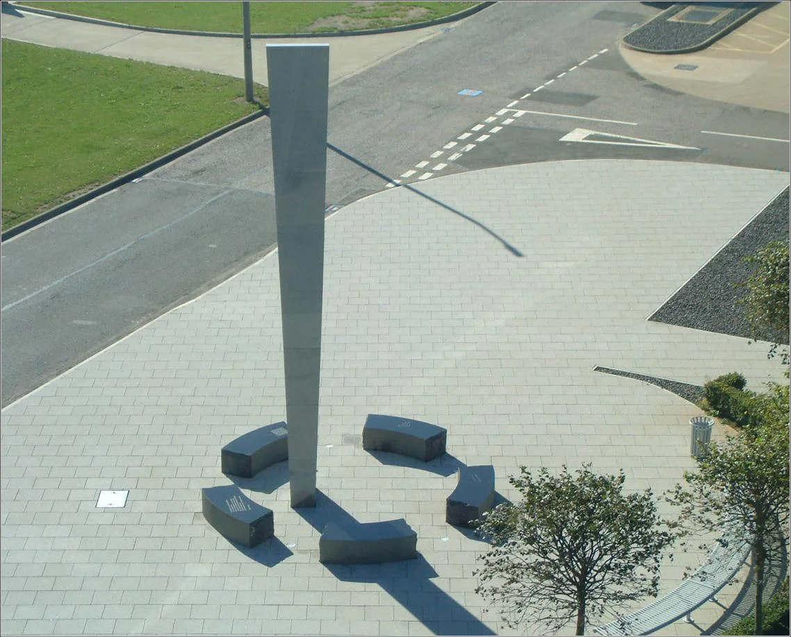 In 2005 Dan Archer was selected by Public Arts Wakefield (now BEAM) to produce a work for the new factory at Novartis Pharmaceuticals near the north Lincolnshire coast. The obelisk is a recurrent theme in Archer’s work; tall obelisks and towers, a fascination with humanities urge towards the sky, and signifiers of important sites. The fragmented ring grounds the sculpture in and includes images and text relating to alchemy and science developed in conjunction with scientists and workers at Novartis.